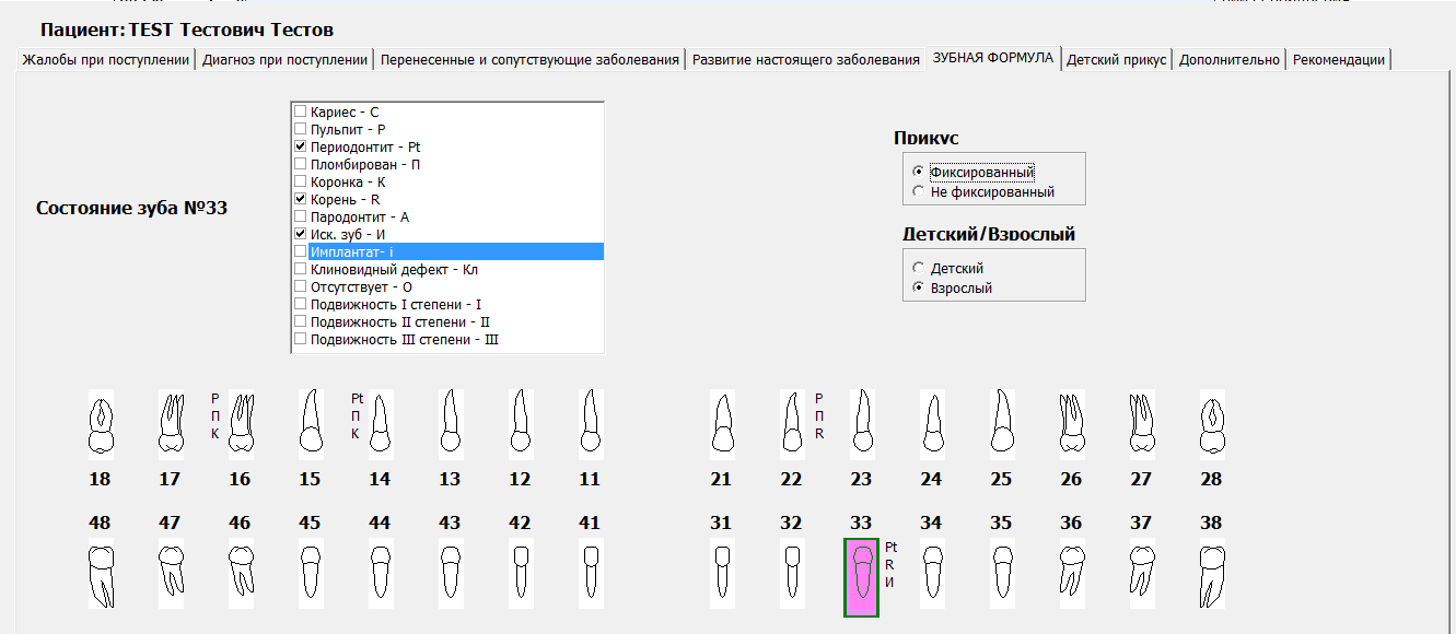 - Создание электронной истории болезни с зубной формулой