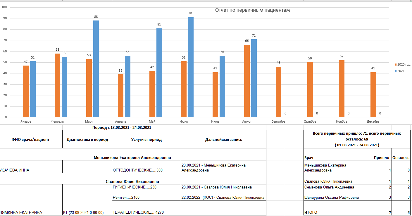 - Общий отчет: сколько пациентов обратилось в клинику, сколько из них записалось и сколько пришло