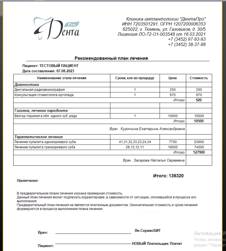 Печать выбранного плана лечения