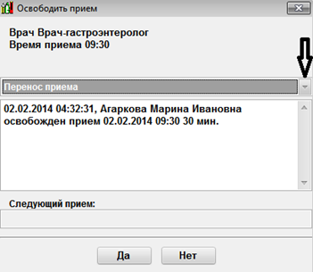 В нем нужно указать причину освобождения приема из выпадающего списка (отмечен стрелкой на картинке), если необходимо, то изменить комментарий, после чего нажать «Да» и пациент снимется с приема.