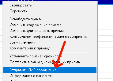 Для отправки сообщения пациенту, необходимо нажать на нем ПКМ и выбрать пункт "Отправить SMS-сообщение"