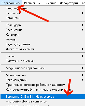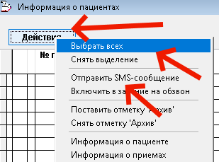 Данное меню есть в картотеке, расписании, центре контактов и отчете "Информация о пациентах" (отчет дополнительно позволяет делать рассылки по отображенному списку пациентов).
