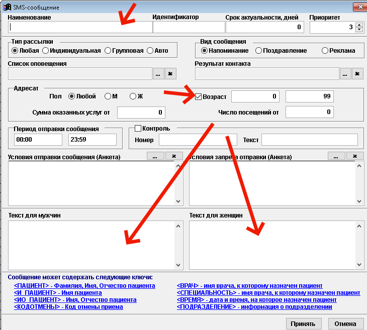 Укажите наименование шаблона, тип рассылки (для одного пациента или для массовой рассылки), вид сообщения, учитывать ли возраст при отправке и другие параметры.
