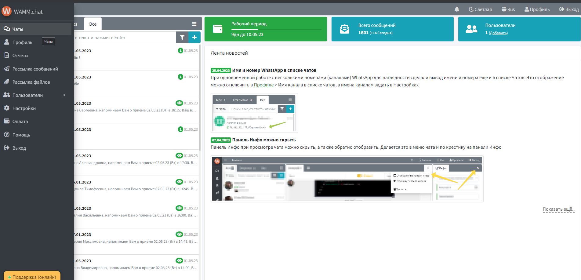 - Отображение статусов «Доставлено», «Прочитано» для сообщений, отправленных через WAMM.chat