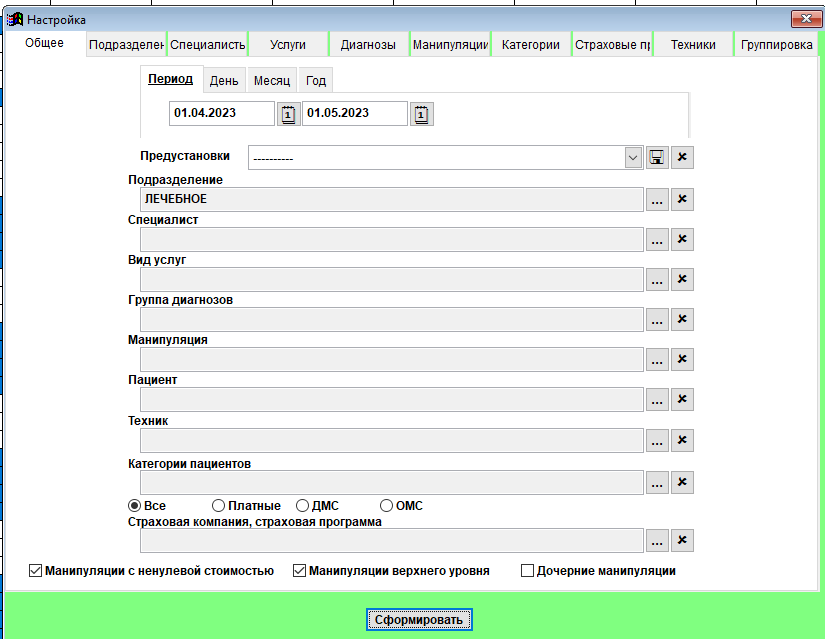 Выбор можно осуществлять по врачу, ассистенту, виду услуг, группе диагнозов, конкретной манипуляции и по конкретному пациенту. Поддержка выгрузки в Excel(при нажатии кнопки «Печать»).