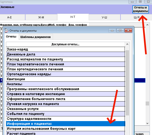Для этого необходимо зайти в картотеку пациентов, нажать справа сверху "Отчеты и документы", далее выбрать пункт "Информация о пациентах" и нажать "Сформировать".