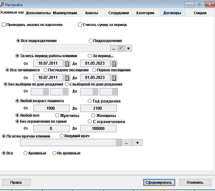 Откроется окно формирования списка пациентов. Нажимаем справа сверху "Настройка".