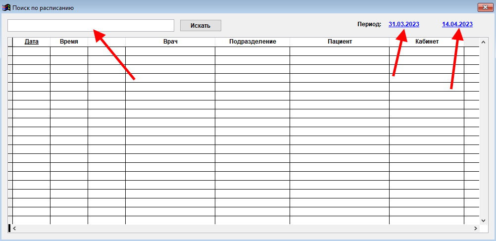 Откроется окно поиска пациента по ФИО. В него вводим ФИО пациента, выбираем период и нажимаем "Искать".