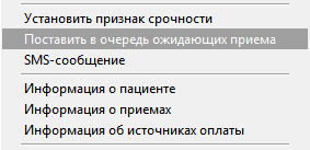 Пациента, поставленные в список ожидающие приема по каким – либо причинам, но не требующие срочного вмешательства. В данный список пациент попадает аналогично предыдущем, в меню необходимо выбрать «Поставить в очередь ожидающих приема»