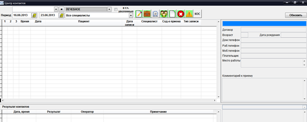 . Помогает в различных статистических отчетах о результатах контактов, количестве снявшихся, неявившихся пациентов. Для доступа к нему, необходимо нажать в главном окне администратора кнопку