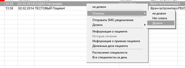 3. После этого, можно осуществлять отметки о дозвоне. Для этого необходимо выбрать правой кнопкой мыши нужного пациента, и в выпадающем меню выбрать нужную отметку