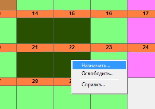 Далее нажимаем ПКМ на любом из отмеченных днях и выбираем "Назначить" (либо "Освободить", если прием снимаем).