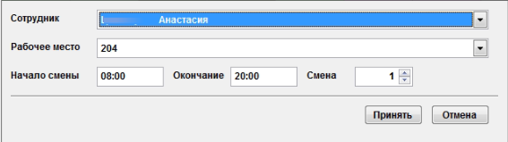 В появившейся форме подтверждаем выбор сотрудника и места, время смены, 1 или 2 смена и нажимаем "Принять".