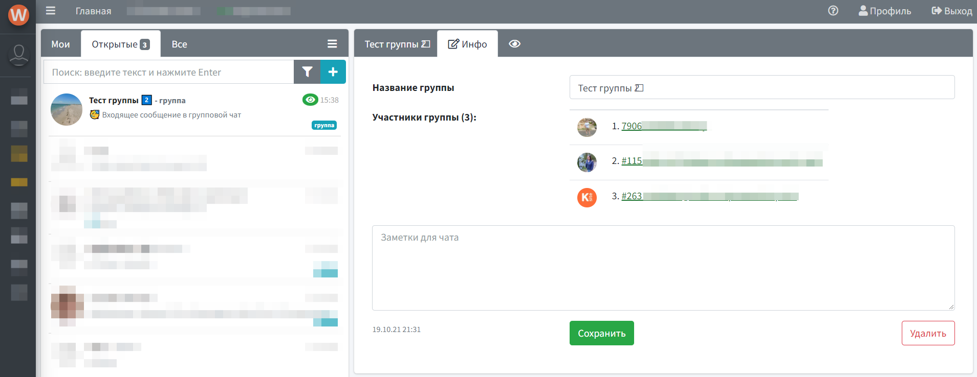 - Во вкладке Мои каждый пользователь видит только те открытые чаты, по которым он является ответственным.
