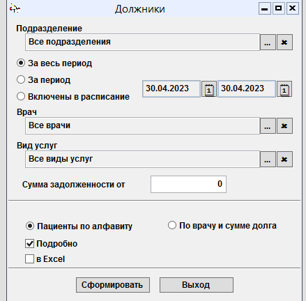 В ней можно выбрать период, за который выбираются должники, должники, которые были в расписании за указанный период, должники по врачу, и по видам услуг.