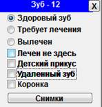 Выбранный зуб– ничего особенного в собственно номере нет. Но если дважды щелкнуть по номеру мышкой, то откроется форма с историей лечения данного зуба, а если щелкнуть правой кнопкой, то откроется альбом снимков по данному зубу.