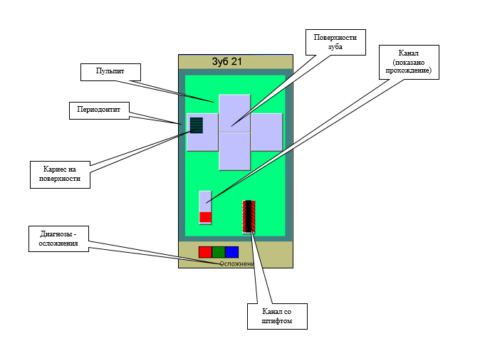 Состояние выбранного зуба пациента и его каналов– графически отображается развертка зуба с поверхностями и каналами – см. рисунок. На поверхностях можно разместить диагнозы группы «Кариес». Рамочкой графически отображаются диагнозы группы «Периодонтит», задним фоном – диагнозы группы «Пульпит». Квадратиками в нижней части – осложнения и прочие диагнозы. При наведении курсора мышки на поверхности, каналы или диагнозы всплывает информация о названии поверхности, канала, диагноза. Двойной щелчок по диагнозу – переход к его лечению. Диагнозы на зубы ставятся на данной форме, прохождение каналов – на форме занесения информации о лечении.