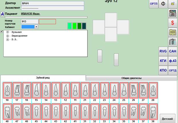Пациент– Фамилия, имя, отчество пациента, карточка которого в настоящий момент открыта. С помощью двойного щелчка мышкой по данному полю можно открыть личную карточку пациента с более подробной информацией об его личности. Под фамилией пациента проведена цветная полоска, которая имеет цвет, соответствующий цвету пациента.