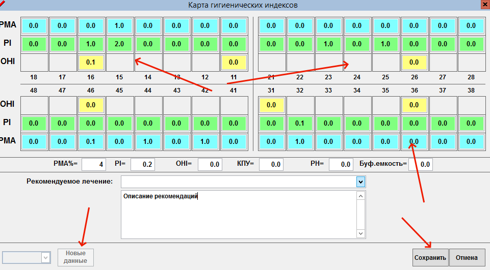 PMA, PI, OHI и т. д. (в нижней части таблицы) - будут рассчитаны автоматически
