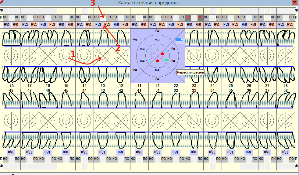 При щелчке на зону под номером 1, откроется форма состояния пародонта возле выбранного зуба.